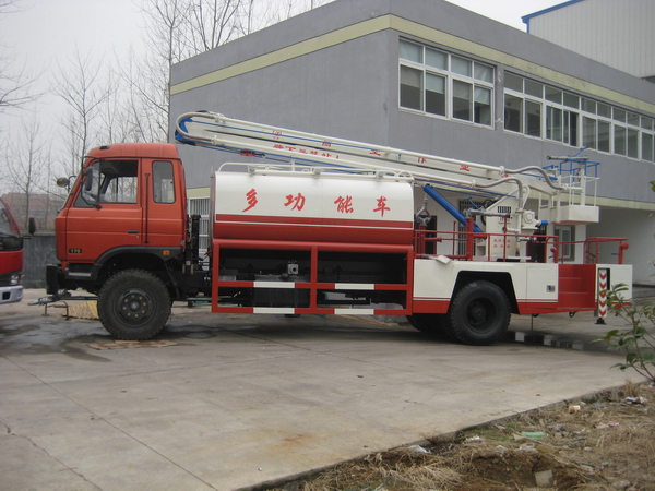 | 專用性能: | 罐體容積為6-7m3,具有自吸自排功能。前沖后灑、側(cè)噴,后置工作臺(tái),帶高壓槍,可調(diào)節(jié)成柱狀,射程≥28m,也可調(diào)節(jié)成霧狀,射程≥14m。廣泛適用園林,消防,電力。高空作業(yè)車專用功能:最大作業(yè)高度:12-14m; 回轉(zhuǎn)角度:360°最大作業(yè)半徑:7.5m; 乘斗載荷:200kg 帶吊吊1噸 該車是根據(jù)用戶要求定制,可在高空作業(yè)工作斗上舉高噴水,另外根據(jù)用戶要求,裝有灑水炮3個(gè),工作平臺(tái)上兩個(gè),高空作業(yè)斗上一個(gè)。 | ||