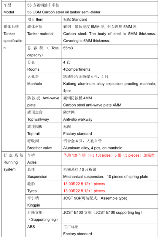 半掛55立方油罐車出口車型配置說明: